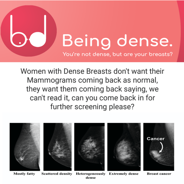 Beingdense.com has a considerable following on social media and I post links to regular, up to date information about Breast Density and Breast Cancer risk research. My primary focus is to ensure that we post about evidence based information and research. I have no scientific or medical background, I do not purport to give medical advice, I am a patient advocate.