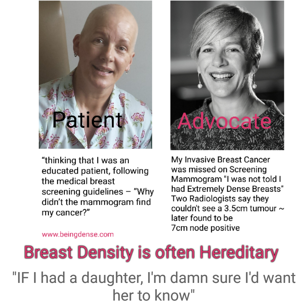 Had I known about my Breast Density, I would still have been diagnosed with Breast Cancer, yes, but I would have known to have Ultrasound or MRI and I would have been diagnosed months, perhaps years earlier. That would have made such a difference to my treatment, my quality of life, my prognosis.