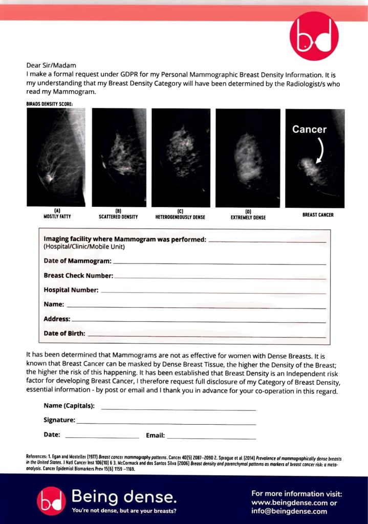 Until our National Screening Advisory Committee adopt these European Recommendations women will have to make individual requests through their GPs say BreastCheck in their most recent HSE Publication. To assist with that we encourage use of our Breast Density Request Form It’s user friendly and holds all relevant details once it’s completed in full.