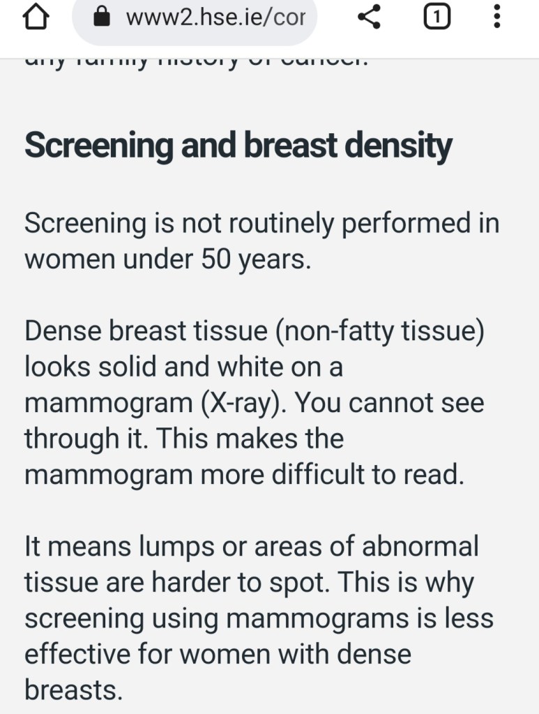 There’s no Standardised Reporting of Breast Density Information for Women as part of Mammogram Breast Cancer Screening, even though Breast Density is recognised by the HSE as a Risk Factor for developing Breast Cancer. The HSE also recognise that Breast Density reduces the reliability and sensitivity of a Mammogram. https://www2.hse.ie/conditions/breast-cancer-women/causes-and-risk-factors/