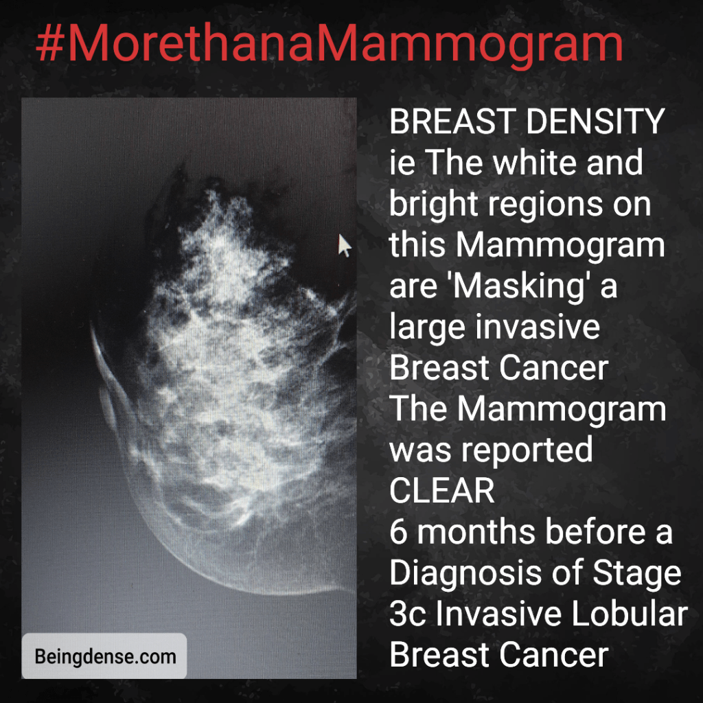 If Breast Density had been acknowledged, recalls for additional imaging should have been made. The Tumour would have been found years earlier. Treatment would have been less Invasive. It was said that the Screening Mammogram, was ‘clear’ but the Breast Tissue was so Dense it masked the sizeable Tumour.